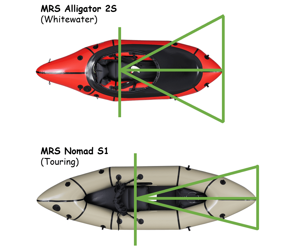 See the below diagram which visually compares a pure whitewater packraft, the MRS Alligator 2S, with a touring specialist, the MRS Nomad S1. You will notice the different pivot points with the MRS Alligator 2S seating position noticeably further back when compared to the MRS Nomad S1. You can see this, compared with the slimmer shape of the MRS Nomad S1, results in very different movements at the front of the packraft.