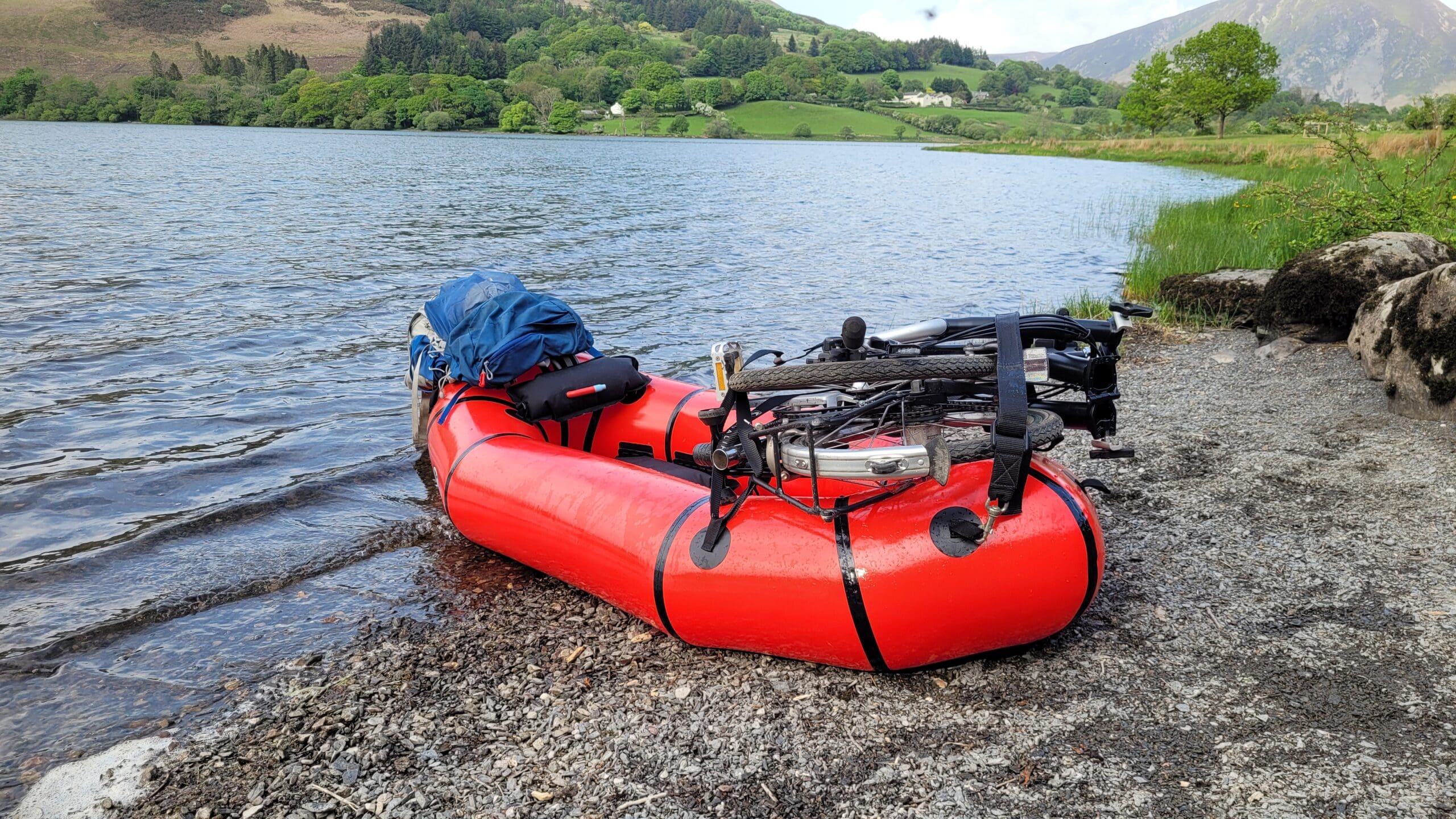 There is a huge amount of buoyancy in a packraft thanks to the large tubes which also sit directly on the water, making them extremely stable – perfect for carrying gear. The key for carrying loads such as a bike, is a stable platform upon which to attach the load, Models such as the Microraft (now slightly wider to make carrying bikes even easier!) are ideal because not only do they have a stable platform to attach a bike (or other gear), they also retain a traditional shape to the bow (the front) which helps maintain efficiency in the way the packraft moves through the water. By contrast, a squared-off bow is less efficient through the water, slower and actually causes more resistance – not helpful for either speed or balance! Those other craft with squared bows also tend to have their bows raised high – this causes another problem. If the weight of your load (such as a bike) is further away from the water, it raises your “vertical pivot” and can leave you prone to more problems with balance than if your weight is closer to the water.