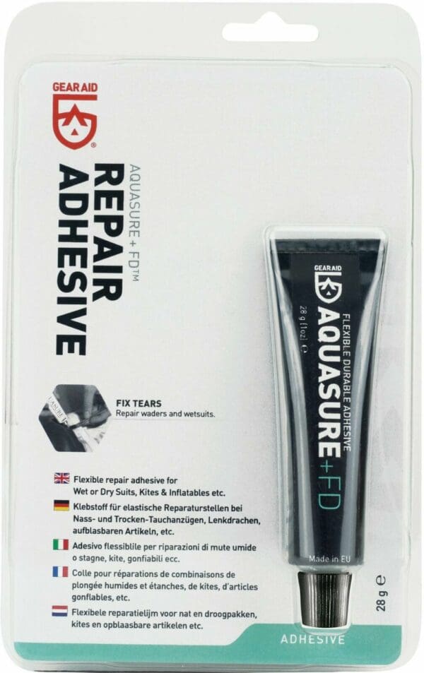 Aquasure FD is a maximum strength urethane-based repair adhesive ideal for making permanent repairs that cannot be broken down with solvents. Once cured, Aquasure provides great abrasion resistance, so it is recommended on high-wear areas. It’s ideal for repairing rips, tears and holes in packrafts, wet suits, dry suits, waders, water sports gear and more. Aquasure offers long-term durability well as excellent adhesion and waterproofing with minimal shrinkage. It is safe for use on natural and synthetic fabrics including GORE-TEX, neoprene, Nypalon, urethane, and rubber. Aquasure requires 8-12 hours to fully cure.